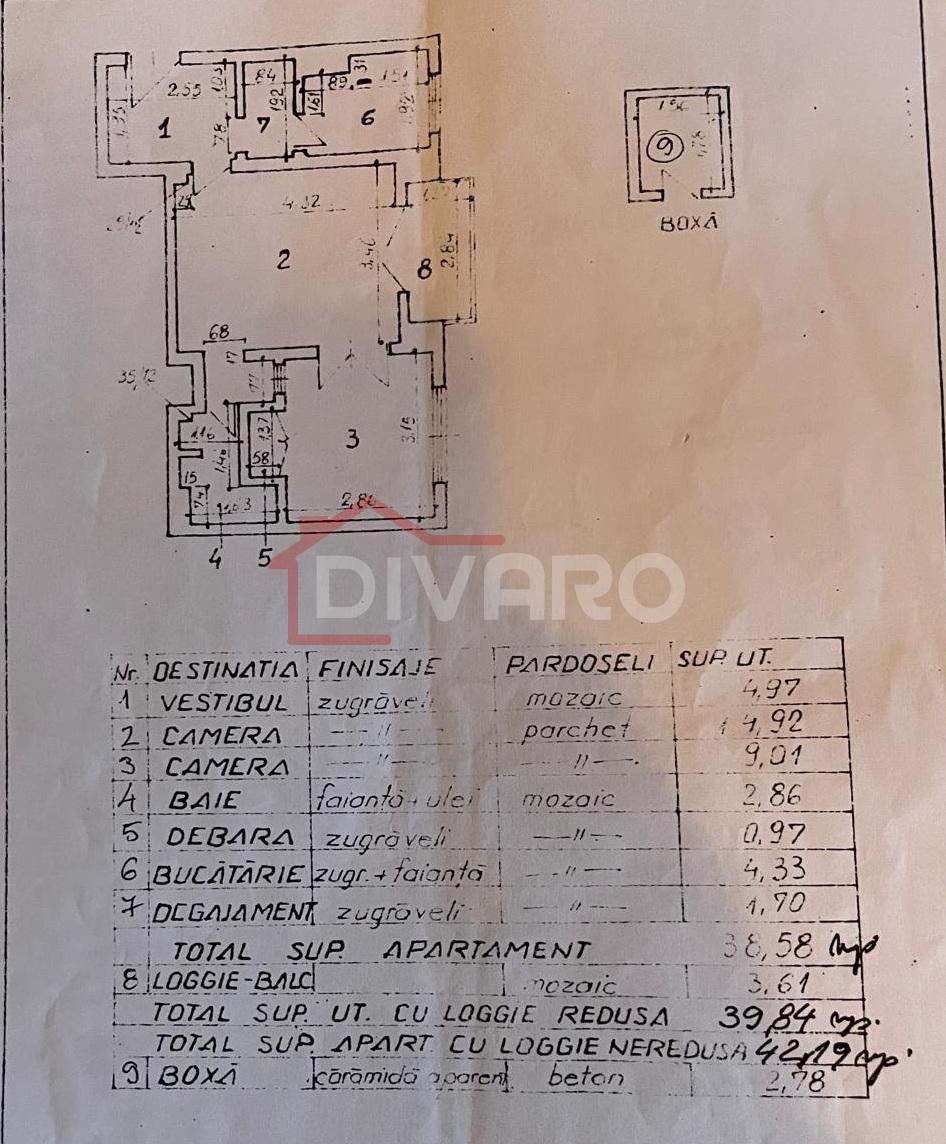 Apartamentul este semidecomandat si are o suprafata totala de 44mp. Se compune dintr-un living luminos, dormitor, bucatarie separata, un mic spatiu pentru depozitare si baie cu dus. De asemenea, are acces la un balcon inchis, iar la nivelul subsolului o boxa ideala pentru depozitare. Locuinta este dotata cu centrala termica proprie, aparat de aer conditionat, parchet din lemn masiv ce merita raschetat si necesita investitii.