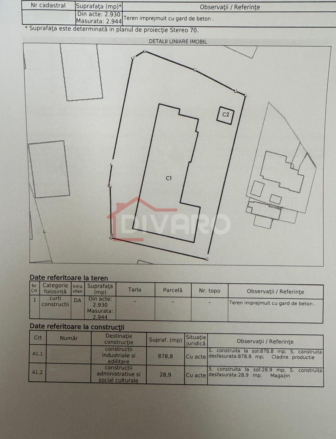 Pe suprafata terenului se afla fosta fabrica de paine. Cele doua constructii existente au o amprenta la sol de 879mp (cladirea de productie), respectiv 29mp (magazinul). Acestea pot fi reamenajate sau demolate, in functie de necesitatile noilor proprietari. Terenul dispune de toate facilitatile necesare utilizarii sale si are acces la strazi asfaltate.